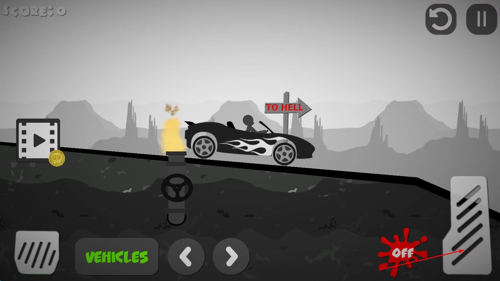 进入游戏后选择关卡,点击“VEHICLES”按钮切换汽车外观,一切就绪后,就可以开启驾驶汽车撞击火柴人的冒险之旅了。