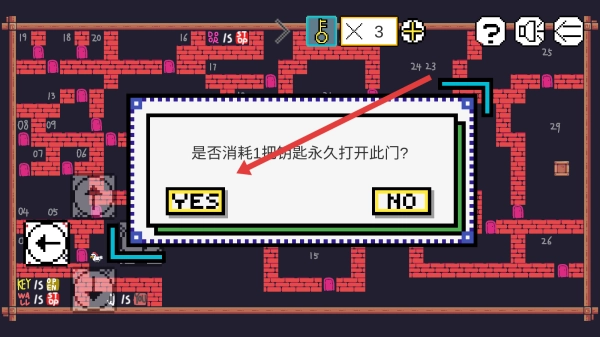 当你在迷宫中遇到门时,如果身上带有钥匙,点击【YES】按钮就能消耗1把钥匙将这扇门永久打开,解锁新的前进路径,从而继续你的冒险之旅。