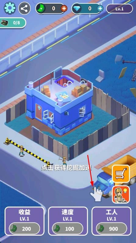 进入游戏后先选定初始的拆迁区域,接着点击房屋来确定具体的拆除位置,然后派遣基础工人启动首次拆迁作业。