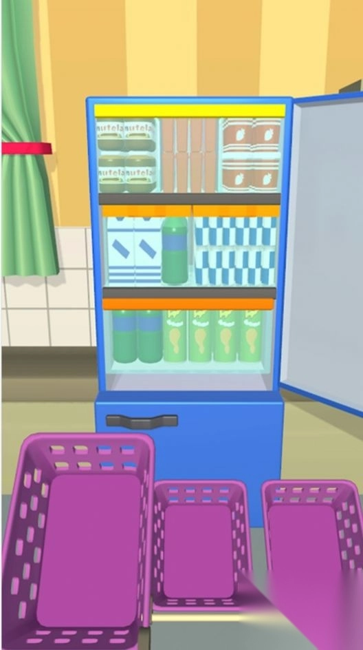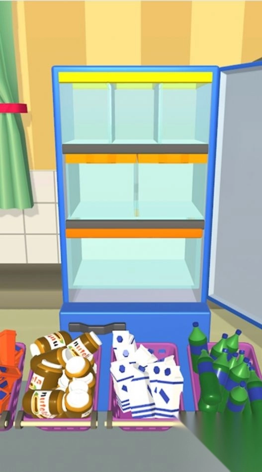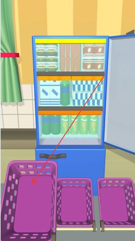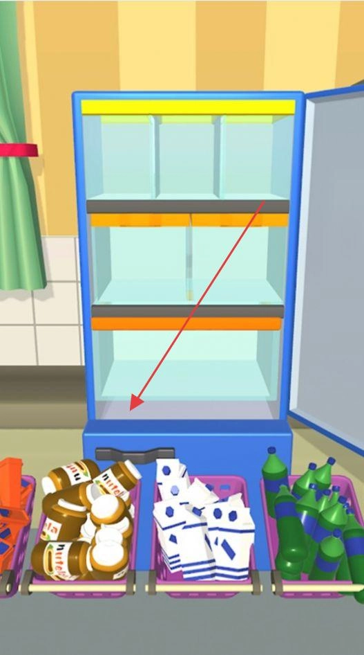 物品摆放完毕后,把空篮子挪到指定地点,这样冰箱整理就完成了,接着进入下一关。