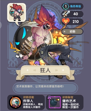 初始技能设定为炸弹人,效果是召唤出炸弹人,让其主动搜寻附近的敌人并引发爆炸;初始秘宝则是爆炸艺术,具体表现为每隔一定时间就会自动释放一次爆炸。
