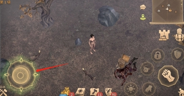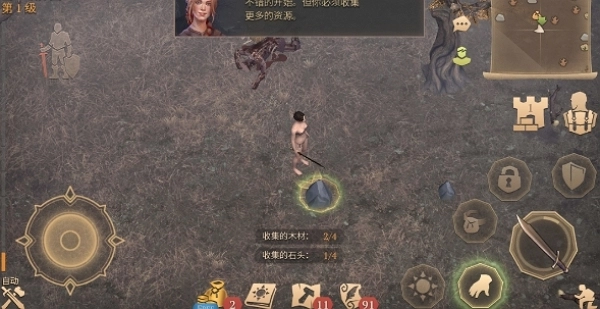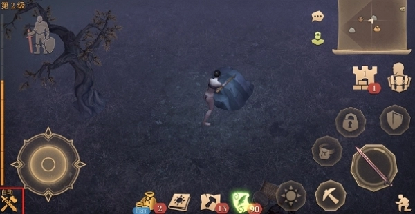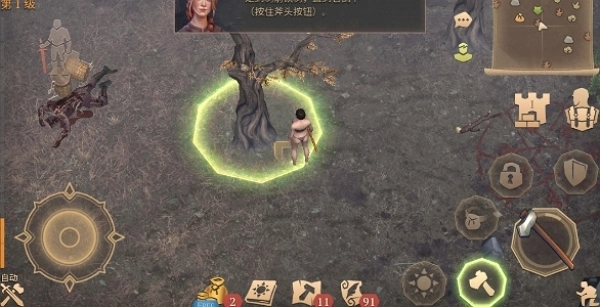 9、然后玩家就可以去砍树,一直点击右下角的斧头按钮,直到树倒下;