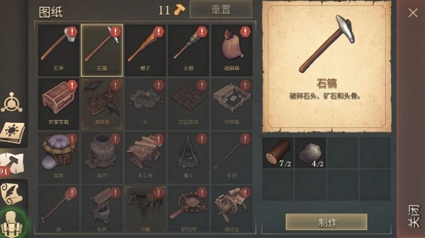 10、还能制作石镐,它可以破碎石头、矿石和头骨;点击左下角最下面那个按钮就可以进行装备;