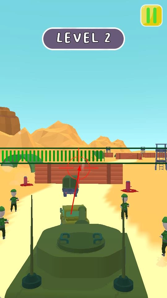 在LEVEL1和LEVEL2关卡中,你需要操控坦克对准沙漠场景里的敌方目标,然后点击进行射击。