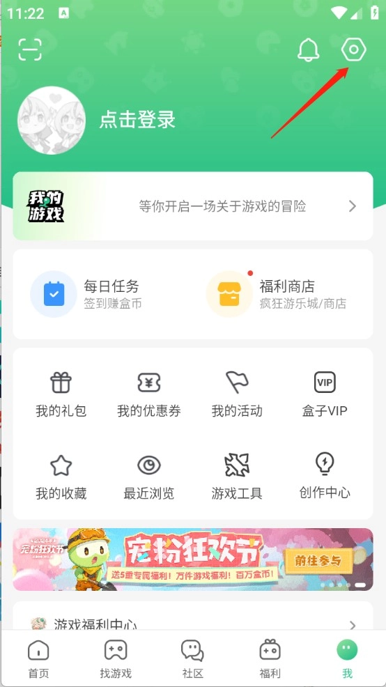1、打开手机上的4399游戏盒,然后点击右上角的设置。