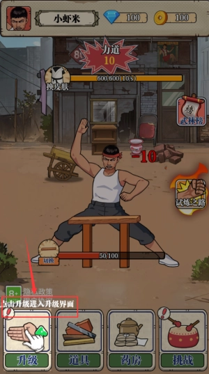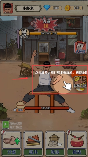 点击屏幕劈木板,提升力道赚取金币奖励。
