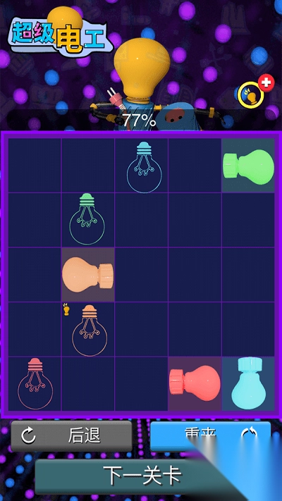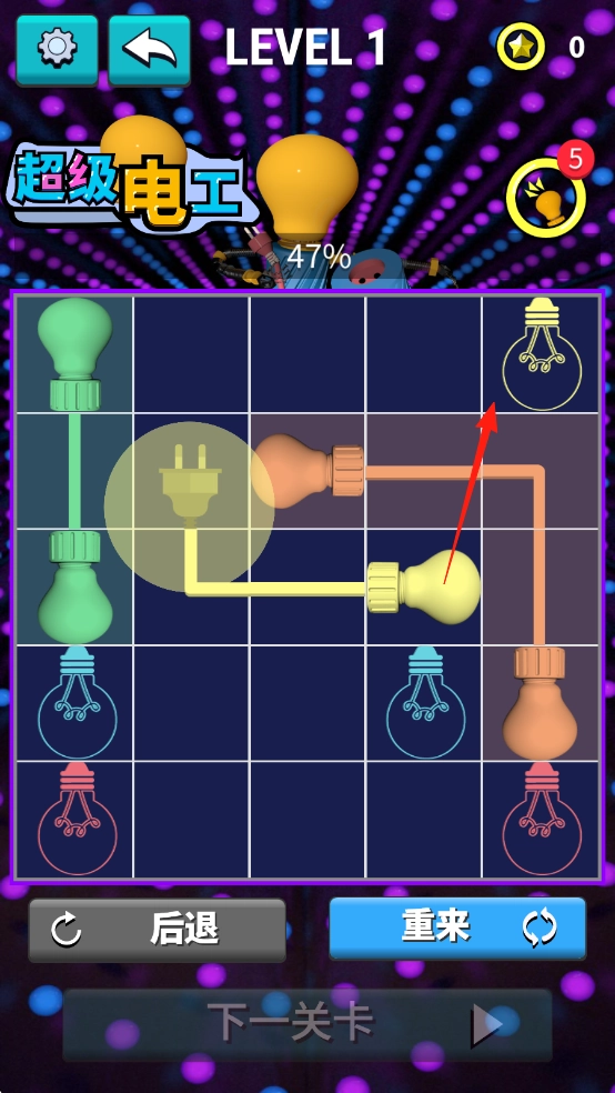 在LEVEL1,你能够拖动彩色灯泡,将相同颜色的电路相互连接,从而使灯泡通电。