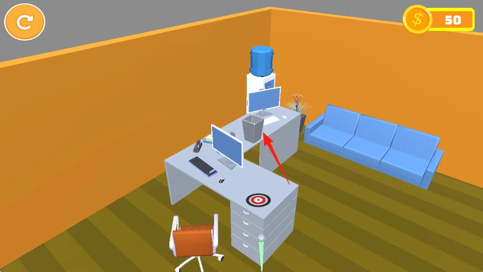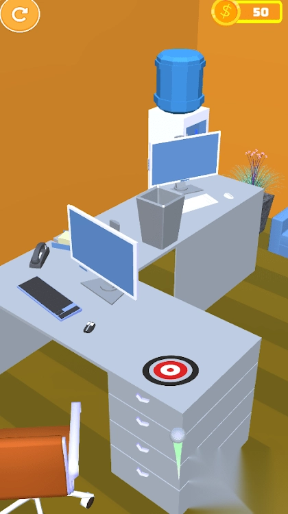 通过调整操作机制来改变击球的角度与力度,引导球避开椅子、电脑等障碍物,使其精准落入绿色垃圾桶或桌上筐这类目标中,一旦成功,金币($)就会从0增加到50。