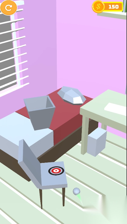 轻量操作与真实物理体验:以"滑动+蓄力"作为核心操作方式,玩家仅需30秒就能快速上手,同时游戏还精准模拟了高尔夫球的重力、反弹及摩擦等物理效果——比如球在地毯上滚动时会逐渐减速,撞击到墙壁则会发生反弹。