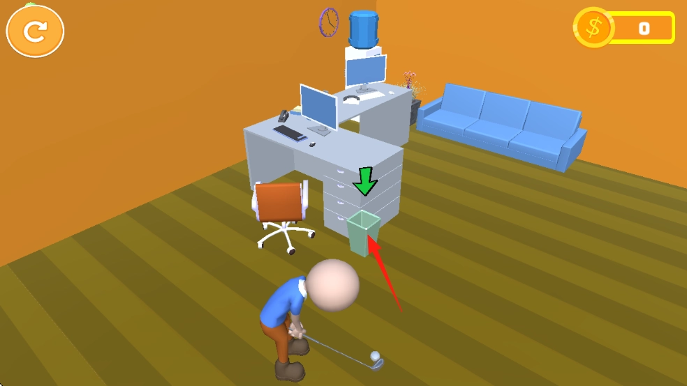 场景设定在包含办公桌、沙发和饮水机的办公室环境中,玩家需要操控火柴人,借助高尔夫球杆,把球击入垃圾桶、目标筐之类的指定容器里。