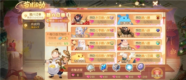 完成活跃和挑战任务,获取食材礼盒。组合多种多样的食材完成食客们的订单,即可领取腊八临时符、纹饰等多种奖励。