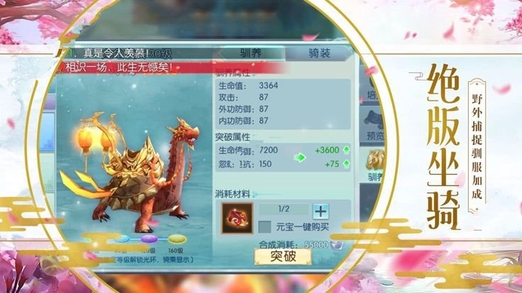 丰富的战斗模式,大量副本资源等你来攻克。超多的坐骑让玩家可以自由的选择,还可以对其进行训练增加战斗力和等级,达到一定的时候就可以开启修仙了。奇幻的游戏地图里面还加入了让舒缓的背景音乐。感受高度真实的仙侠世界。
