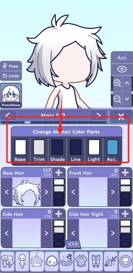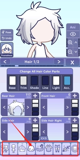 4、发型的设置选项十分丰富,还划分成不同的发片,无论是刘海部分还是后侧的头发都能自行选择样式,并且每个发片都可以单独更换颜色。