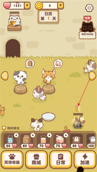 点击右下角的加速按钮,能提升猫咪们的进食速度,让爱心获取得更快。