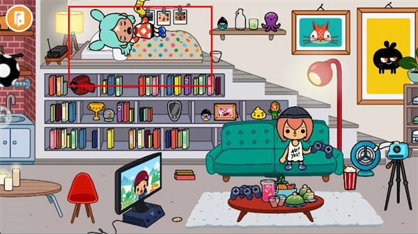 采用明亮鲜艳的卡通手绘风格,房间里的书架、沙发、台灯等元素都还原了真实的生活场景,连茶几上的零食、沙发旁的游戏手柄都刻画得细节饱满,让人仿佛走进了一间温馨的现实房间。