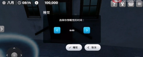 6、抵达家门口后可选择休息时段,界面左上角会显示游戏内的月份、具体时间以及当前资金情况。