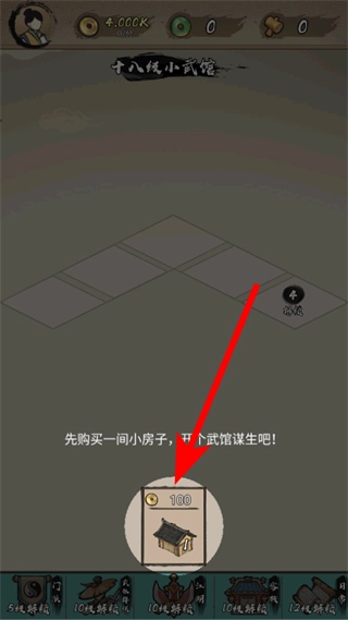 在武馆初始界面,找到那个消耗100铜钱的小房子图标并点击,通过购买房产来开启属于自己的武馆。