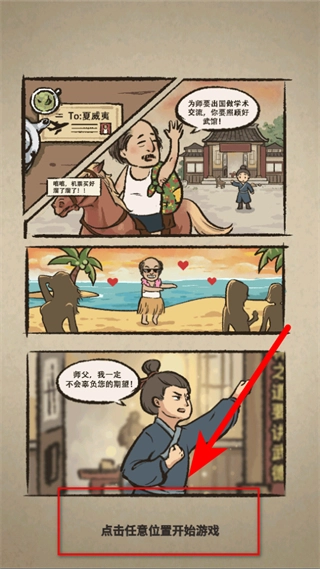在剧情漫画界面,点击任意位置即可跳过剧情内容,进入游戏的武馆经营环节。