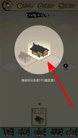 当你拥有多个1级武馆时,把其中一个1级武馆拖动到另一个1级武馆的位置上,就能将它们合成为更高级的2级武馆。