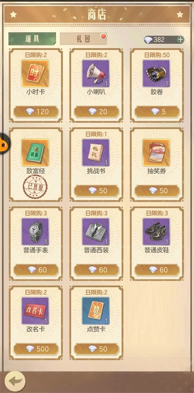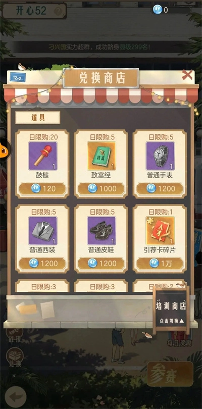 前期优先购买魅力道具、经验卡、人参、普通西装、普通皮鞋、普通手表、火车票(必买)