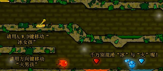 刚开始同时移动冰女孩和火男孩往前进,他们两分别穿过最底下的通道,注意火男孩收集红色钻石,冰女孩收集蓝色钻石,两个人一起往上前进。上面有个坑跳过去,还有个机关扳动它,会下来一个黄色的板,跳上去再跳到台阶上。