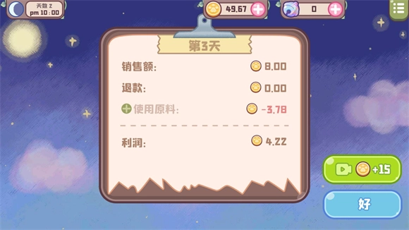 4、当时间结束后就会结束一天的经营,此时玩家会看到一天的收入。