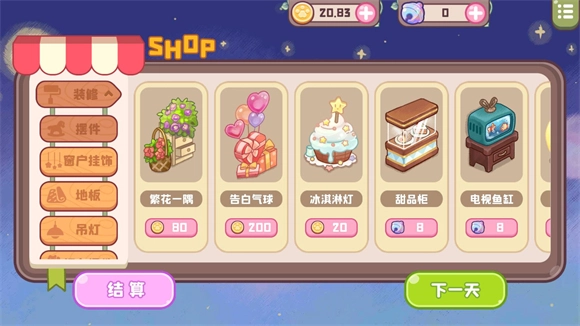 5、查看收入后可以选择对店铺升级或者解锁更多的装饰,又或者是继续下一天的经营。