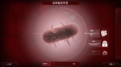 细菌(Bacteria):它是最常见的瘟疫病原体,拥有不可估量的潜力。在所有病原体里,细菌是最容易上手的类型,各项能力都比较均衡,既能用激进的方式快速进化以增强传染性,也能采取稳妥的策略循序渐进地推进游戏进程。