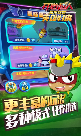 《开心超人机甲联盟》是一款动作冒险题材的手机游戏,它获得了《开心超人》的正版授权并由此改编而成。游戏不仅操作简单易上手,画面也十分精致细腻,还具备热血十足的战斗模式,感兴趣的朋友可千万别错过啦。