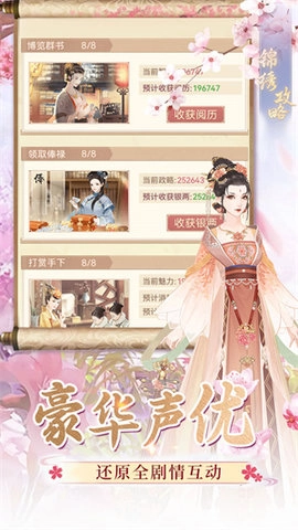 在《锦绣攻略》这款游戏里,玩家能体验到强烈的代入感,就好像真的身处古代后宫之中。游戏内设置了众多可供玩家攻略的角色,每个角色都具备独特的魅力,而顶级的画面效果更是为玩家带来了绝佳的视觉享受。