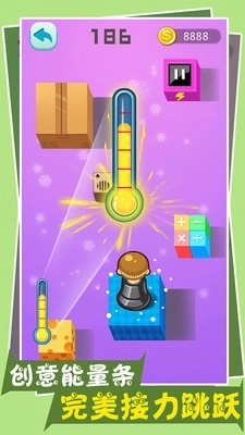 1.游戏采用经典的跳一跳游戏风格,同时融入了创意能量条设计,玩家可以完美接力跳跃,增加游戏的连贯性和可玩性。
