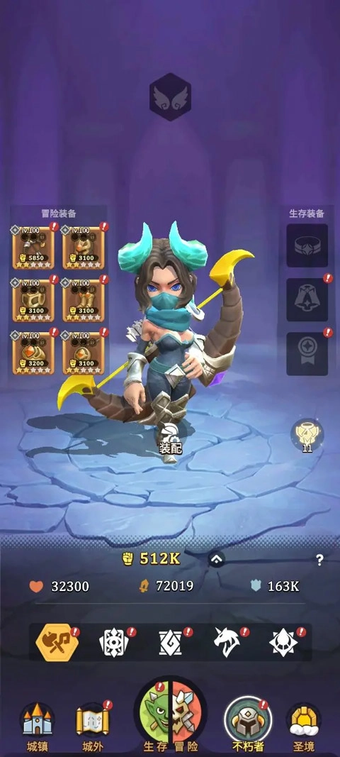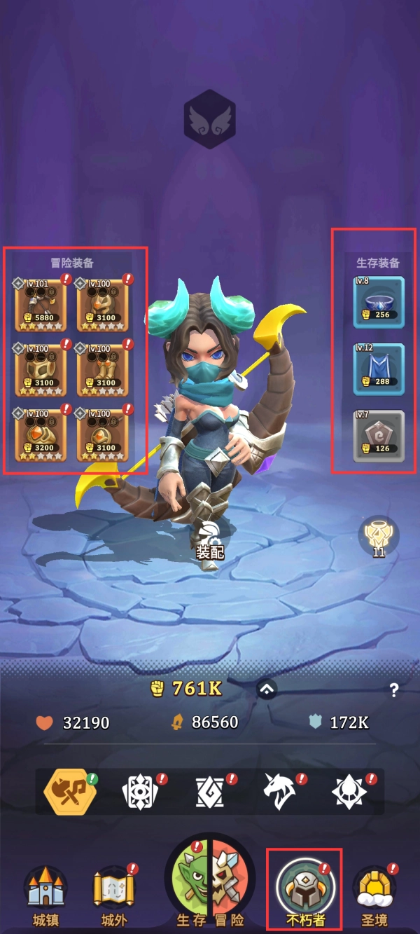 冒险装备:冒险装备分为六个部位,武器、头盔、盔甲、靴子、戒指、项链。