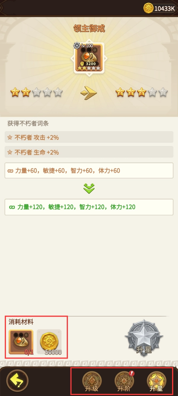 装备品质可通过上述提到的方式提升,等级和共鸣的提升方式和生存装备提升相同,另外,星级提升同样在装备强化页,需要使用相同的物品方可升星。宝石可直接镶嵌(通过购买不朽月卡、挑战厄难边境获得),套装效果需要穿戴指定数量的同系列装备方可激活。