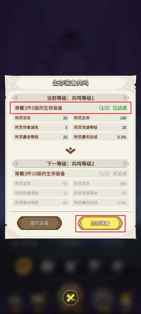 可提高玩家参与生存玩法时初始角色的属性,通过附灵、生存装备提高角色属性可以应对后续关卡更轻松。另外,生存装备还具有冒险词条,可在冒险模式中生效。