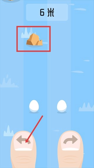 2、游戏中显示当前进度为【6米】,当上方出现【岩石】障碍时,点击底部左侧的箭头按钮,控制角色躲避障碍。