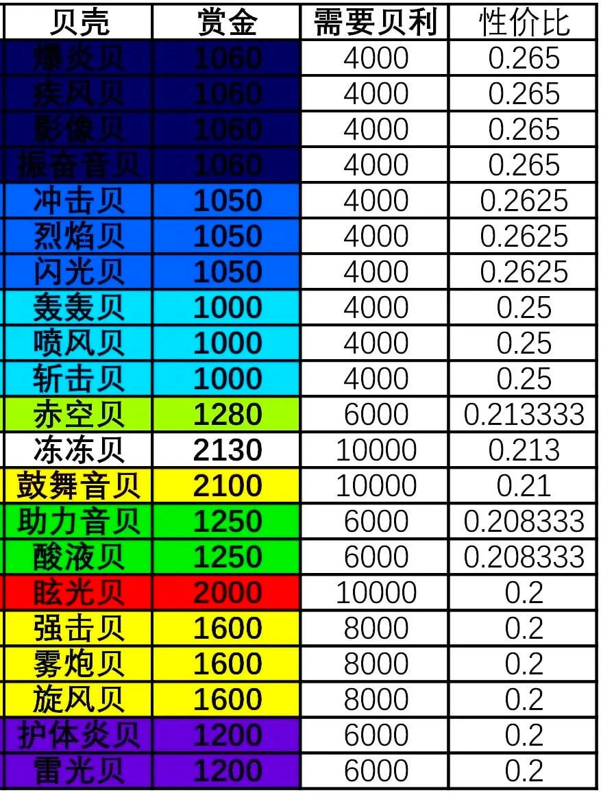 之前提到过部分空岛贝无需激活,但实际上一些冷门空岛贝搭配特定角色时效果不错,所以建议尽量都激活。升级方面参考这个表格,按从上到下的优先级来,赤空贝以下的只升级常用的就行,不常用的激活后放着不用管,非必要不用升级!