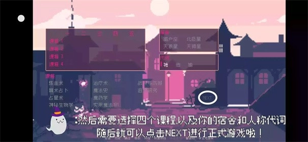 要继续推进游戏进程,记得把课程选够四门才行哦!另外宿舍和代词的选择也别漏掉啦,不同的课程搭配会让你邂逅不一样的角色呢!
