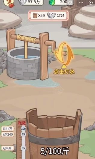 打水:点击打水,水会到木桶里,最低20水量即可挑水!建议一定要到100水量再挑,可以获得最高奖励1万!
