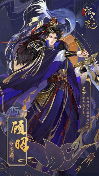 墨发蓝衣的顾昭,在游戏里是大成国极有声望的大将军。他不爱去上朝,是因为厌烦与朝中各党派勾心斗角;论起打仗的本事,那可是顶尖的。大成国君对他既倚重又忌惮,而顾昭心中最大的期盼,便是天下太平,百姓能安稳度日、丰衣足食。