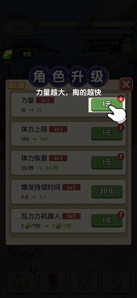 通过持续提升角色等级,加快拾取废弃物的效率,完成一连串任务,获取更多金币并收集更多装备与道具。