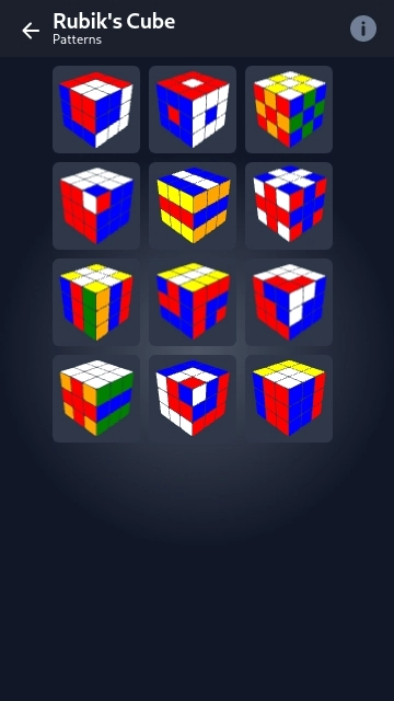 以常见的三阶魔方为例,点击该魔方后,通过【Learn】选项可掌握三阶魔方的基础还原逻辑与步骤;选择【Patterns】则能尝试达成特定的魔方造型;而【Solve】作为核心功能,可进入为用户生成魔方还原策略的模块。
