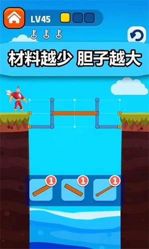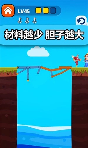 操作非常简单,只要搭好桥,让我们的男主顺利过河,去向女神表白,完成这份爱情心愿就可以啦。游戏的关卡数量不少,前期难度较低,到了后面的关卡,就需要你充分发挥智商来挑战咯。