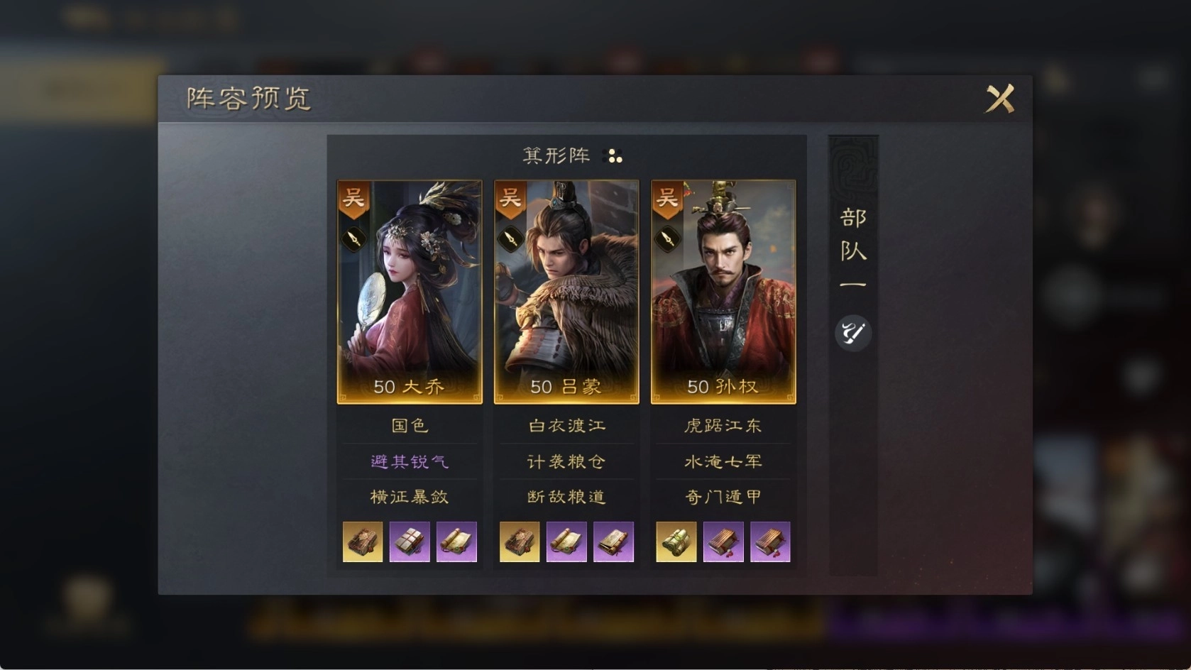 大乔、吕蒙、孙权这套阵容的核心思路在于,通过给敌军施加各类异常状态来实现控制效果,同时打出高额的爆发伤害。像“断粮”“技穷”这类控制状态,能有效克制部分主动战法队伍和指挥战法队伍,不过在面对速攻爆发型队伍时则会处于下风。