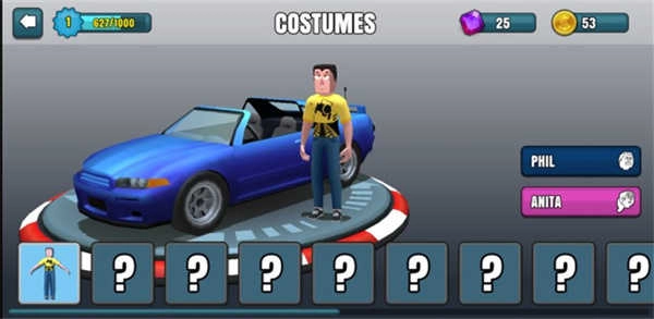 进入游戏后,界面下方设有换车、服装的功能选项,不过大多需要付费解锁;第三个按钮用于选择场景,最右侧则是开始游戏的按键。