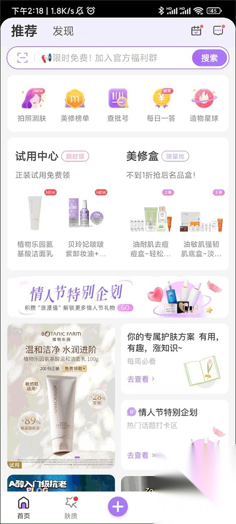 首先打开美丽修行应用,在搜索栏的旁边能看到一个拍照测肤的功能选项,点击该功能即可。