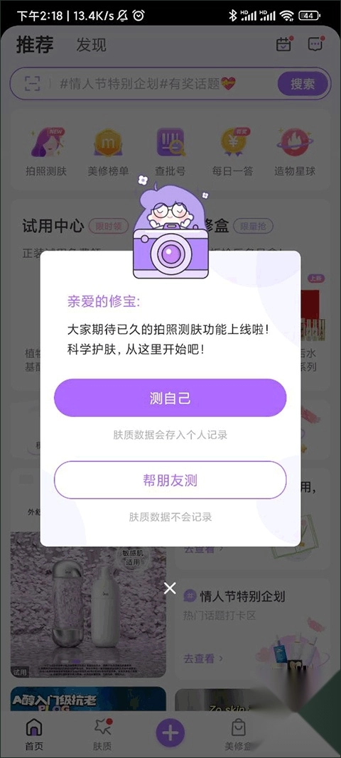 3、参与测试来了解自己皮肤的小秘密,要是想获得同样的皮肤推荐,也能找一位和自己肤质相同的好朋友,一起分享产品以及各自的皮肤护理使用方法。