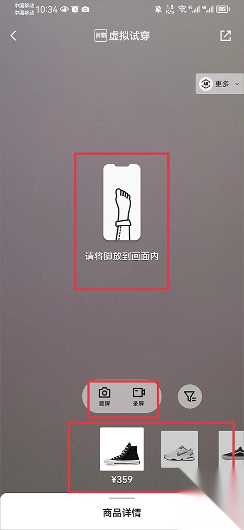 3、接着在虚拟试穿的界面里,把脚放进画面中,再通过下方的左右切换按钮来更换鞋子尝试试穿,要是觉得满意,就能进行截屏或者录屏操作