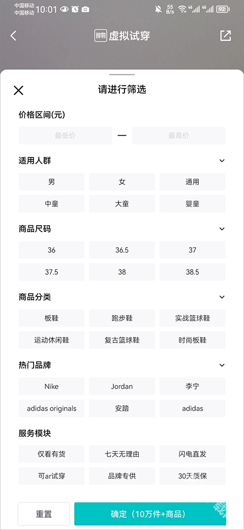 4、点击录屏右侧的筛选按钮,还能依据价格、品牌、尺码、类型等条件筛选出合适的鞋子
