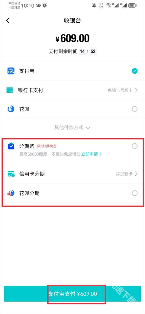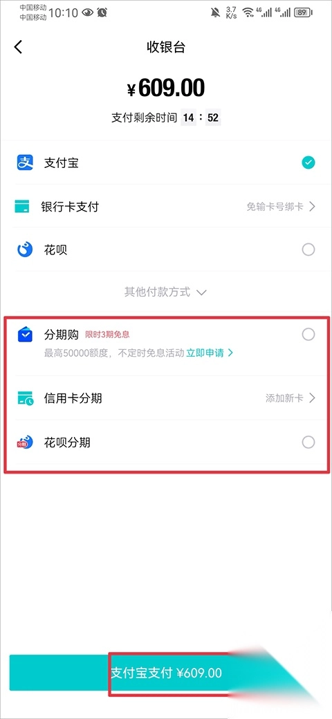 3、最后在支付环节,选择分期购、信用卡分期或者花呗分期中的任意一种方式完成付款就可以了