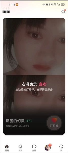 1、进入首页后,用户可以通过右滑操作向异性表达好感,也能主动与异性打招呼。